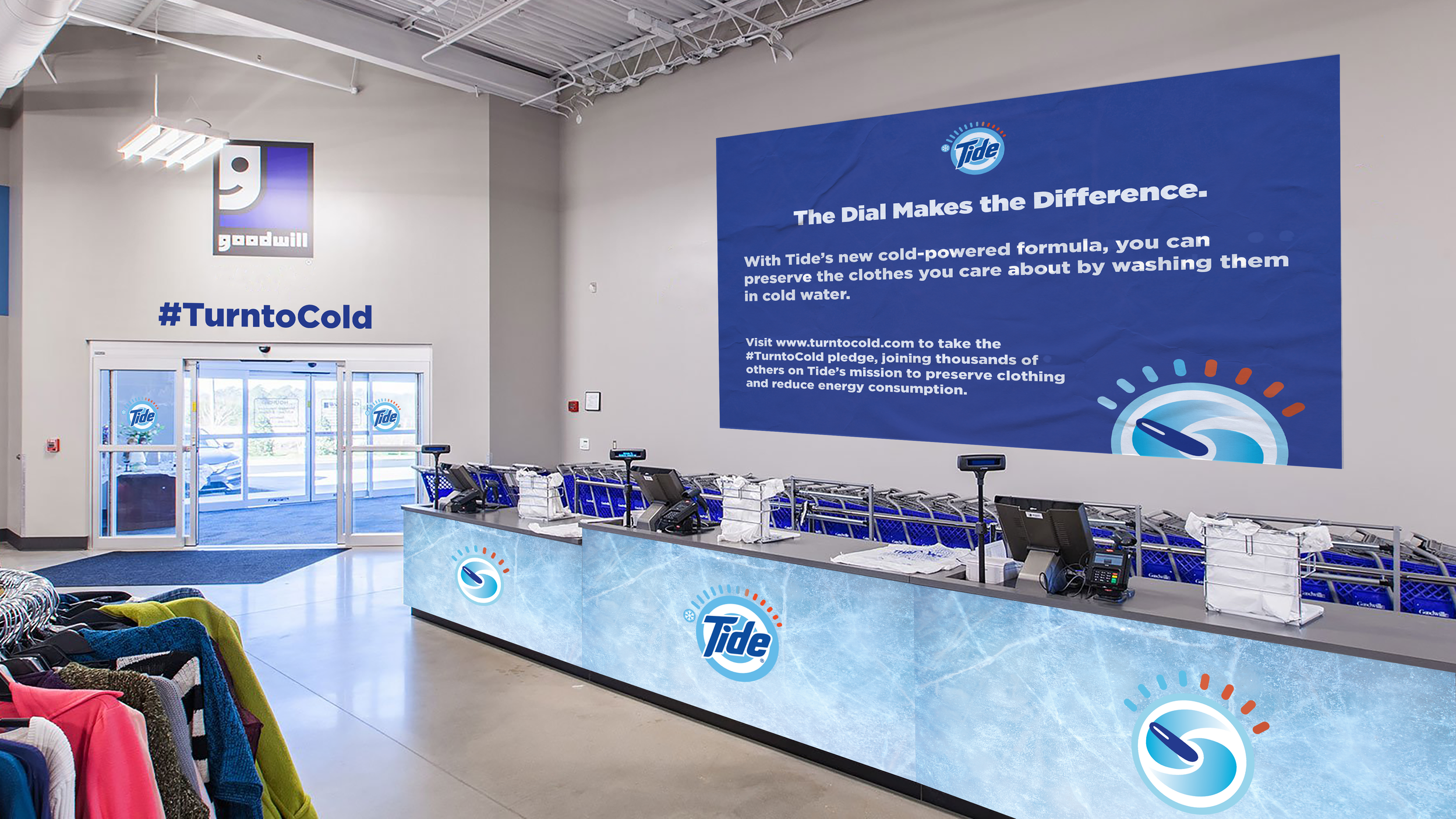 Goodwill retail takeover — integrating Tide’s cold-wash messaging into check-out counters and in-store visuals.